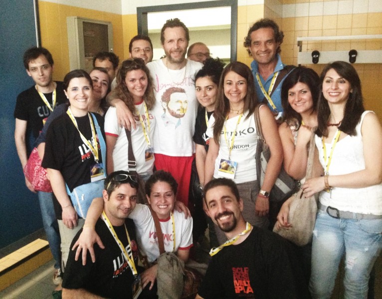 Così praticamente mi avvento su Jovanotti e forse, un po’ l’ho preso alla sprovvista vista la reazione, parto con una super sintesi di presentazione, siamo YOUNG il gruppo giovani di AISM, l’Associazione Italiana Sclerosi Multipla gli porgo la maglietta –